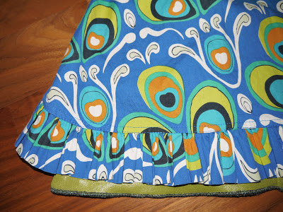 Der Schnitt ist eine leicht veränderte Willemientje von Farbenmix, ohne Godets, dafür am Rücken leicht gerafft, was bei Momo fast immer nötig ist, damit die Kleider nett fallen. Drunter gab's ein einfaches, weißes Shirt mit angenähten Rüschen.